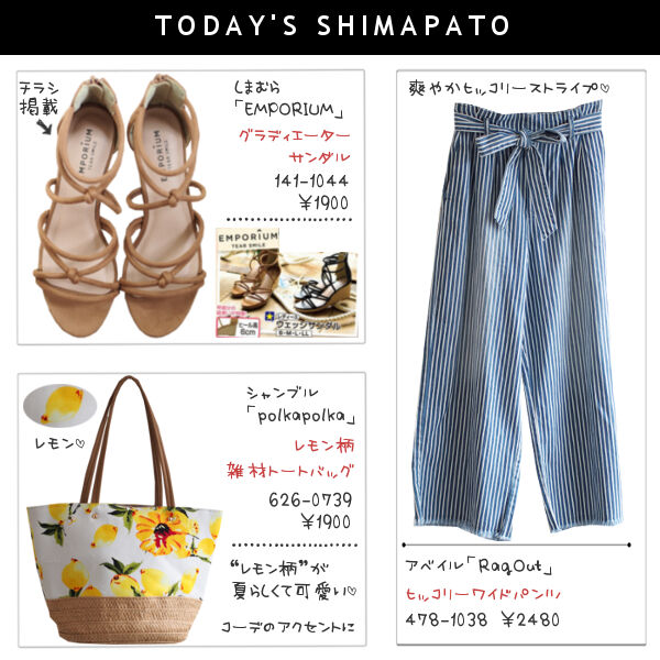 2018.5.31 【しまパト】チラシ掲載グラディエーターサンダル、ヒッコリーワイドパンツ、レモン柄かごバッグ 昨日、しまむらと系列店のアベイルとシャンブルへ行ってきました! 購入品の詳細は後ほどひとつずつ記事にしますが、その前に購入したものをざっくりとご紹介したいと思います。しまパト♡ 購入品サンダル:しまむら 1,900円(141-1044) パンツ:アベイル 2,480円(478-1038 ... 続きを読む