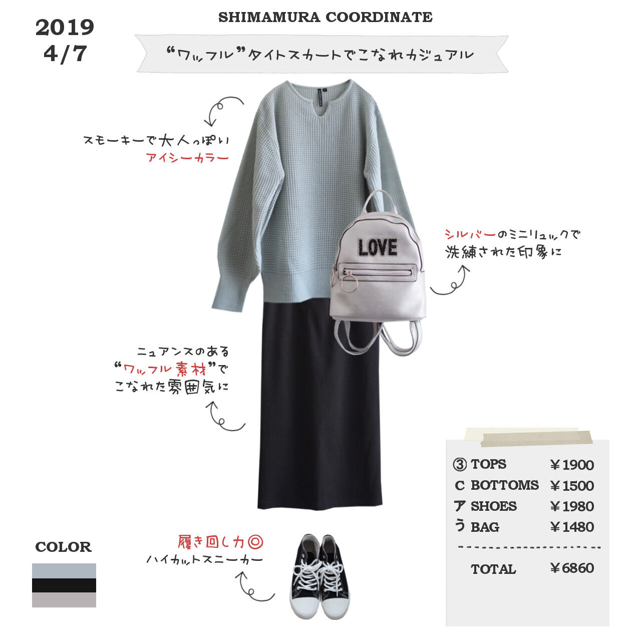 2019.4.28 【しまむら一か月着回しコーデ】ゆったりニット×ワッフルスカートでこなれカジュアルコーデ しまむらアイテム全50点を使って「一か月着回しコーデ」。4月7日のコーデです。ゆったりニット×ワッフルスカートでこなれカジュアルコーデ3.ニット:しまむら 1,900円(513-1576) C.スカート:しまむら 1,500円(522-1885) ア.スニーカー:アベイル 1,980円(531-3151) ... 続きを読む