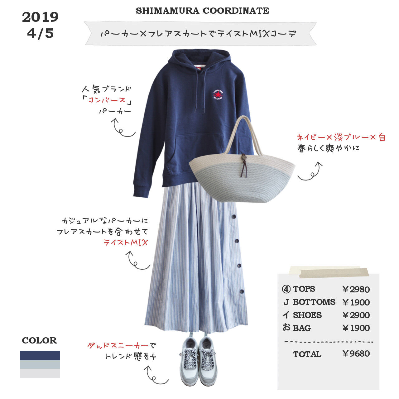 2019.4.25 【しまむら一か月着回しコーデ】「コンバース」パーカー×フレアスカートでカジュアルフェミニンMIXコーデ しまむらアイテム全50点を使って「一か月着回しコーデ」。4月5日のコーデです。「コンバース」パーカー×フレアスカートでカジュアルフェミニンMIXコーデ4.パーカー:アベイル 2,980円(170-0547) J.スカート:しまむら 1,900円(552-0901) イ.スニーカー:しまむら 2,900 ... 続きを読む