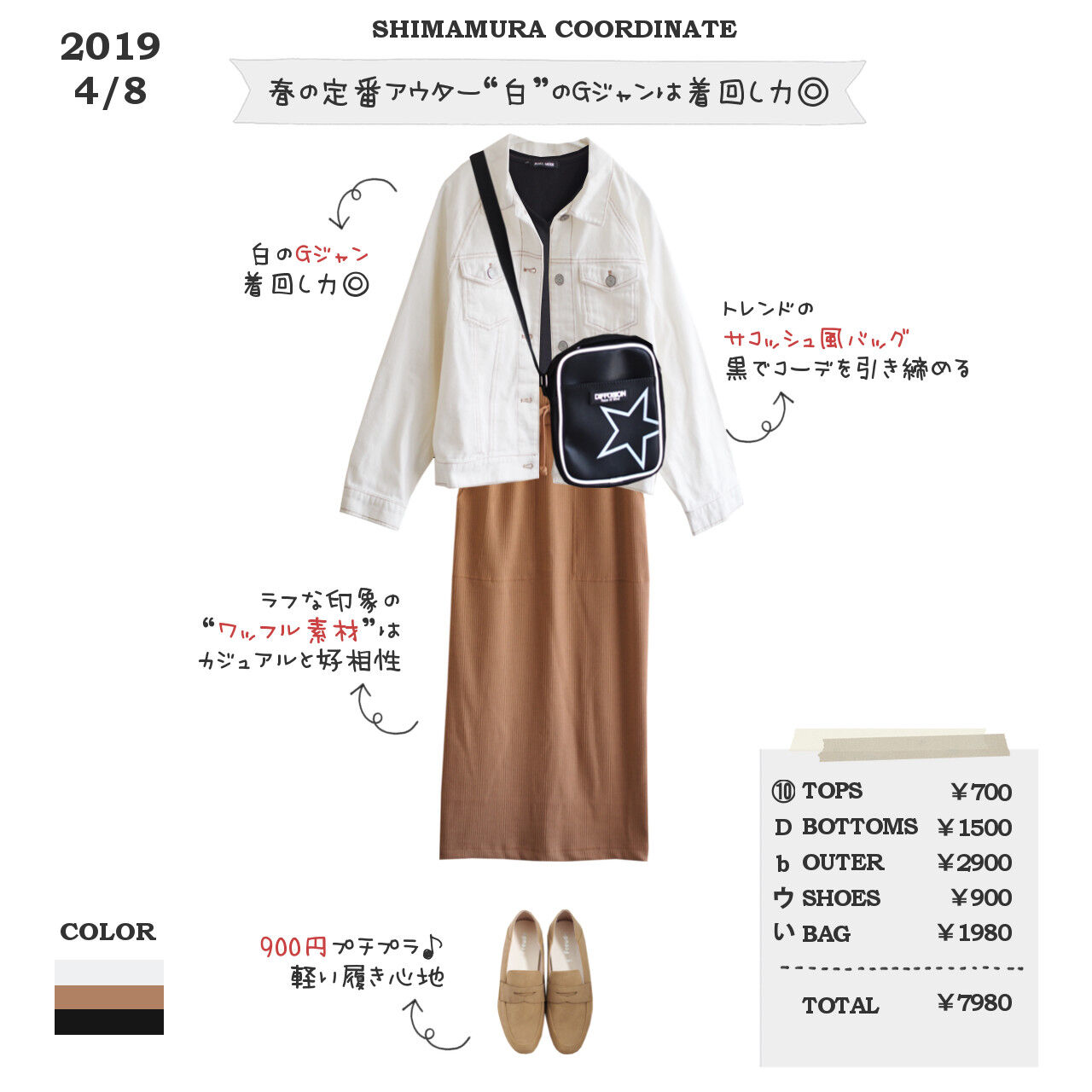 2019.4.29 【しまむら一か月着回しコーデ】白のGジャンは着回し力◎、ワッフルスカートで大人カジュアルコーデ しまむらアイテム全50点を使って「一か月着回しコーデ」。4月8日のコーデです。白のGジャンは着回し力◎、ワッフルスカートで大人カジュアルコーデ10.Tシャツ:アベイル 700円(410-4839) D.スカート:しまむら 1,500円(522-1879) b.Gジャン:しまむら 2,900円(528-1014 ... 続きを読む