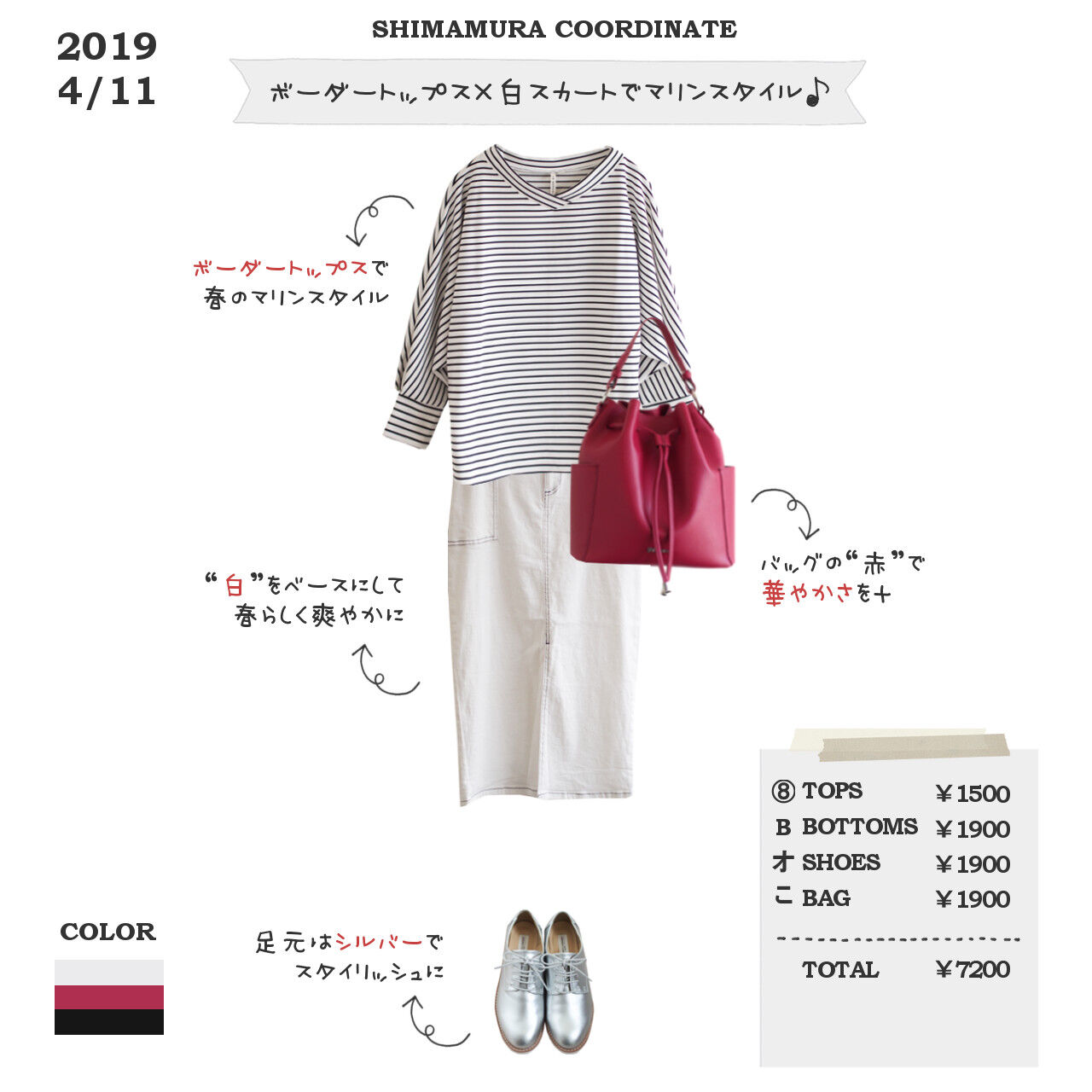 2019.4.30 【しまむら一か月着回しコーデ】白ベースで好感度UP!ボーダー柄トップスで春のマリンスタイル しまむらアイテム全50点を使って「一か月着回しコーデ」。4月11日のコーデです。白ベースで好感度UP!ボーダー柄トップスで春のマリンスタイル8.プルオーバー:しまむら 1,500円(502-0837) B.スカート:しまむら 1,900円(522-1896) オ.シューズ:しまむら 1,900円(143-2 ... 続きを読む