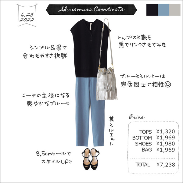2022.6.25 【全身しまむら7238円コーデ】爽やか♡ブルーのパンツ/ブルーとシルバーは寒色で相性◎/黒で大人っぽく こんにちは。6月25日のコーデです。ニット:しまむら 1,320円(513-2531)パンツ:しまむら 1,969円(538-0732)ミュール:アベイル 1.980円(534-1681)バッグ:しまむら 1,969円(346-1142)合計で7,238円の全身しまむらコーデです。※カッコ内は商品の品番です。※アベイ ... 続きを読む