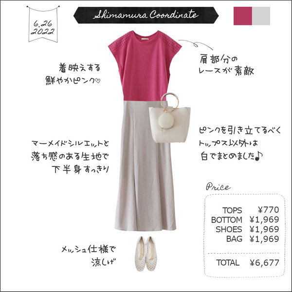 2022.6.26 【全身しまむら6677円コーデ】770円プチプラTシャツ/着映えするピンクが主役/すっきり2色コーデ こんにちは。6月26日のコーデです。Tシャツ:しまむら 770円(501-8980)スカート:しまむら 1,969円(552-0047)パンプス:しまむら 1,969円(2020年購入)バッグ:しまむら 1,969円(343-1590)合計で6,677円の全身しまむらコーデです。※カッコ内は商品の品番です。◆今回 ... 続きを読む