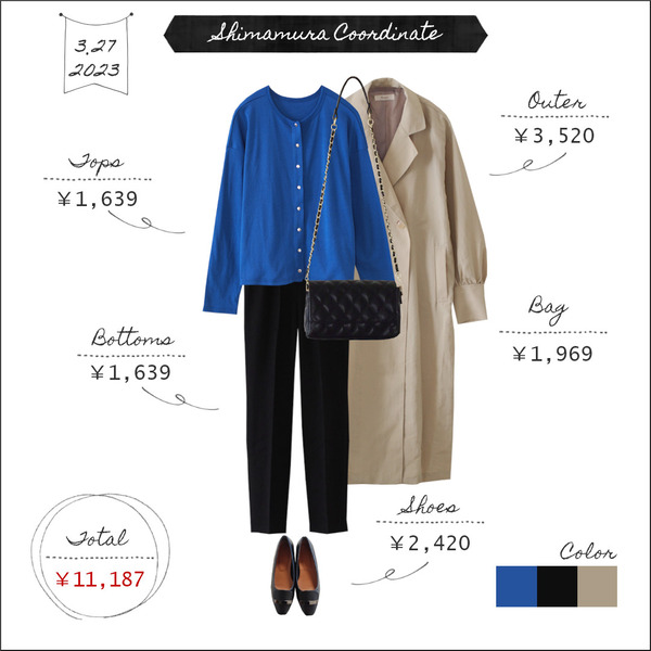 2023.3.28 【全身しまむら11000円台コーデ】配色から考える<ブルー>⑨~爽やかさや誠実さを印象づける色~ こんにちは。3月27日のコーデです。カーディガン:しまむら 1,639円(508-0309)パンツ:しまむら 1,639円(554-0005)コート:しまむら 3,520円(537-1541)パンプス:しまむら 2,420円(144-0895)バッグ:しまむら 1,969円(346-0678)※カッコ内は商品の品番です。◆先週 ... 続きを読む
