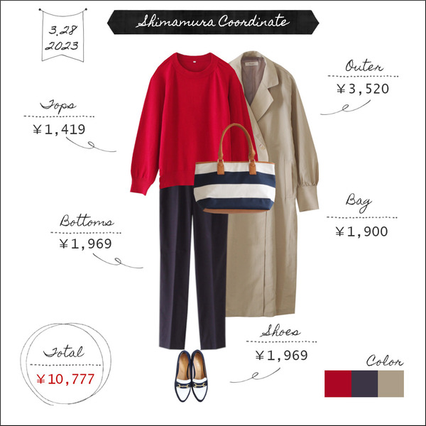 2023.3.29 【全身しまむら10000円台コーデ】配色から考える<赤>⑩~華やかで積極的な印象を与える色~ こんにちは。3月28日のコーデです。ニット:しまむら 1,419円(513-0244)パンツ:しまむら 1,969円(554-1356)コート:しまむら 3,520円(537-1541)ローファー:しまむら 1,969円(2020年購入)バッグ:しまむら 1,900円(2018年購入)※カッコ内は商品の品番です。◆先週 ... 続きを読む
