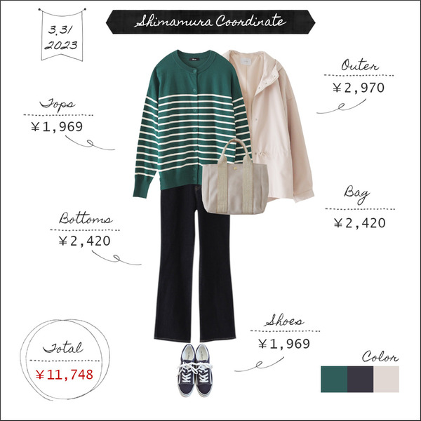 2023.3.31 【全身しまむら11000円台コーデ】配色から考える<グリーン>⑬~ヘルシー&ナチュラルなカラー~ こんにちは。3月31日のコーデです。カーディガン:しまむら 1,969円(512-1817)パンツ:しまむら 2,420円(558-1527)マウンテンパーカー:しまむら 2,970円(2020年購入)スニーカー:しまむら 1,969円(2021年購入)バッグ:しまむら 2,420円(343-2567)※カッコ内は商品 ... 続きを読む