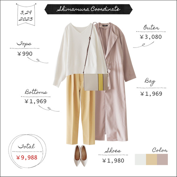2023.3.30 【全身しまむら9000円台コーデ】配色から考える<イエロー>⑪~元気な気分になるトレンドカラー~ こんにちは。3月29日のコーデです。ニット:しまむら 990円(2020年購入)パンツ:しまむら 1,969円(2021年購入)コート:アベイル 3,080円(476-0019)パンプス:アベイル 1,980円(532-0696)バッグ:しまむら 1,969円(346-1355)※カッコ内は商品の品番です。※アベイル ... 続きを読む