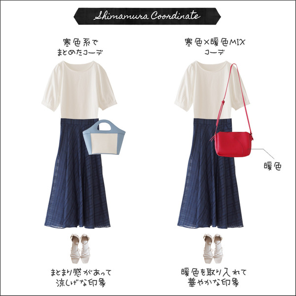 2023.7.29 【全身しまむら】「寒色×暖色」で好印象の配色を作る こんにちは。涼しげな印象になる寒色系の色と温かみを感じる暖色系の色。色の寒暖をミックスさせることで配色のバランスが取れて心地良い配色になります。ふたつのコーデを並べてみました。左のコーデの配色は白×ネイビー×ブルー。寒色系で作る配色でまとまり感があり涼し ... 続きを読む