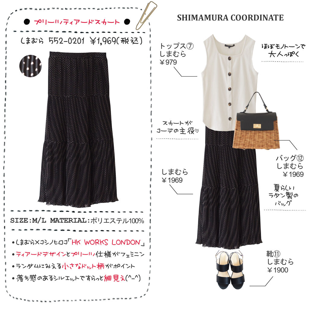 スカートは、しまむらとデザイナー・コシノヒロコのコラボブランド「HK WORKS LONDON」の新作。ティアードデザインとプリーツ仕様が女性らしいアイテムです。スカート丈は約88cmで、身長158cmでマキシ丈。