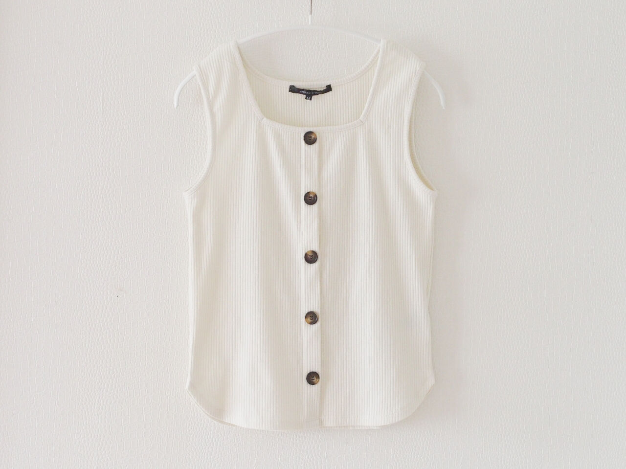 タンクトップは、しまむらのトレンドブランド「FLASH BLUE」の商品。今季は、フロントにボタンが並ぶタンクトップをよく見かけますね。基本色の白で、ボトムスを選ばず着回し力抜群。ボトムスにインしても出して着ても、どちらもきれいに決まります。