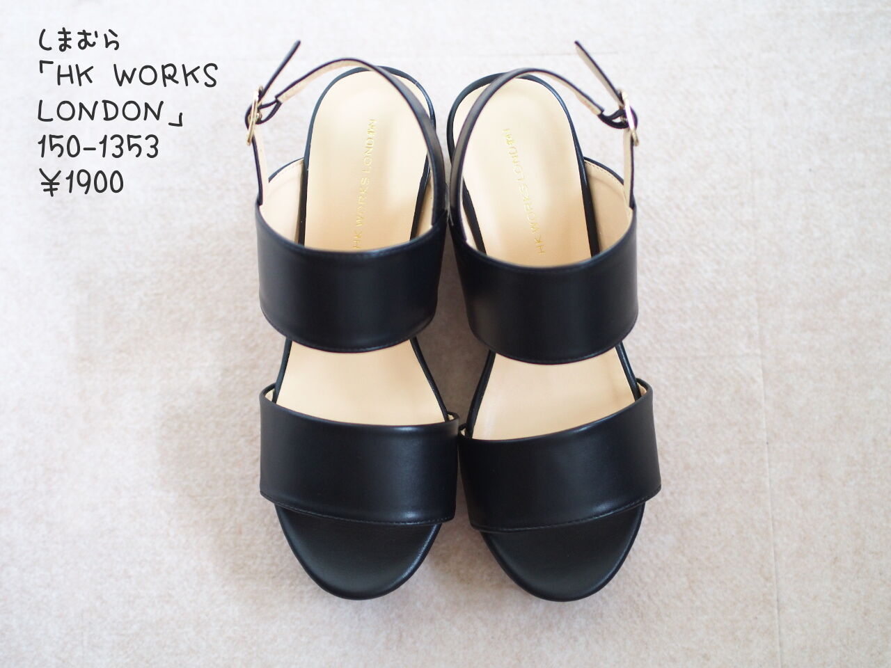 足元は、スカートと同じく黒のサンダルを選んで、すっきりとまとめました。スカートと同じく「HK WORKS LONDON」の商品で、昨年購入したもの。コルク素材のウェッジソールは、高さ約7cm。安定感があって歩きやすく、スタイルアップ効果もあります。