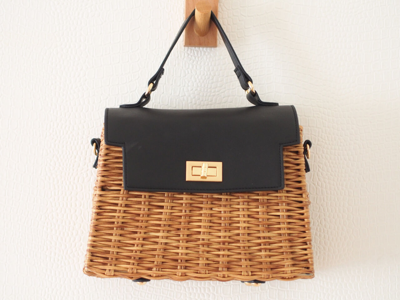 バッグは、ラタン素材が夏らしいアイテム。フラップが黒の合皮でできているので、今回のコーデにしっくりとなじみます。