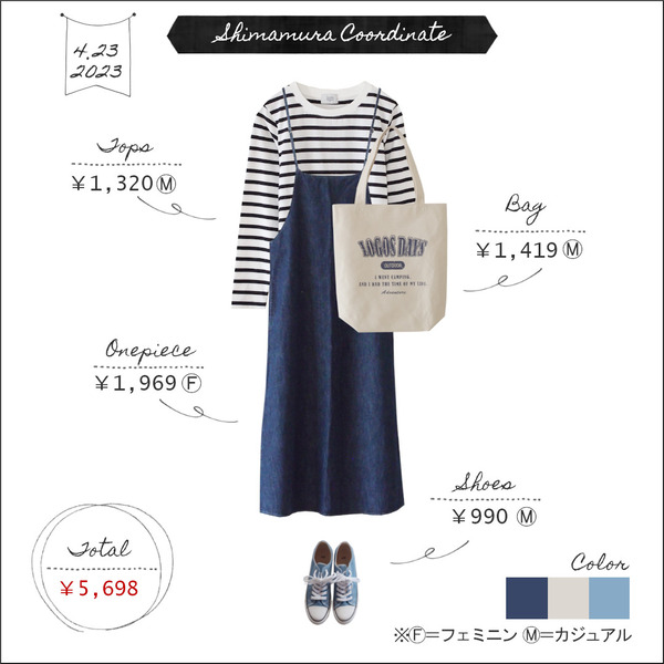 2023.4.23 【全身しまむら5000円台コーデ】新作ロゴバッグを持って♪デニムキャミワンピで普段着コーデ こんにちは。4月23日のコーデです。Tシャツ:アベイル 1,320円(2021年購入)ワンピース:しまむら 1,969円(2021年購入)スニーカー:しまむら 990円(148-1152)バッグ:しまむら 1,419円(344-1844)※カッコ内は商品の品番です※アベイルはしまむら系列店です※Fはフェミ ... 続きを読む